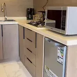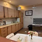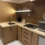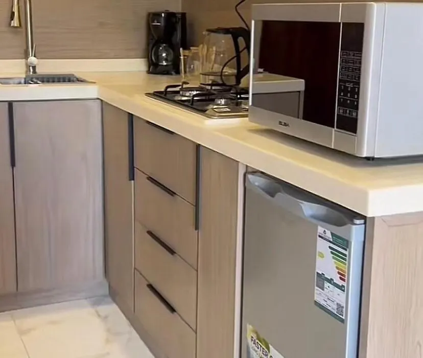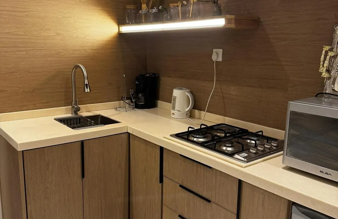 The kitchen amenities at the Mecca accommodation feature tea and coffee making facilities, a refrigerator, and kitchenware, provided in a dining area.